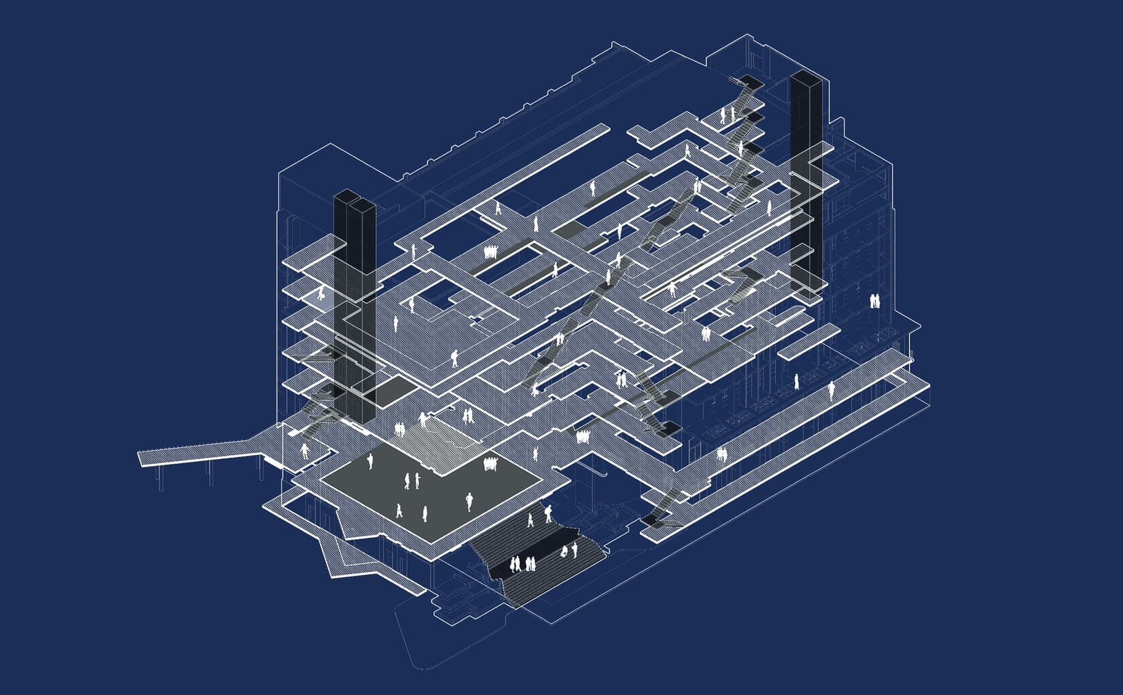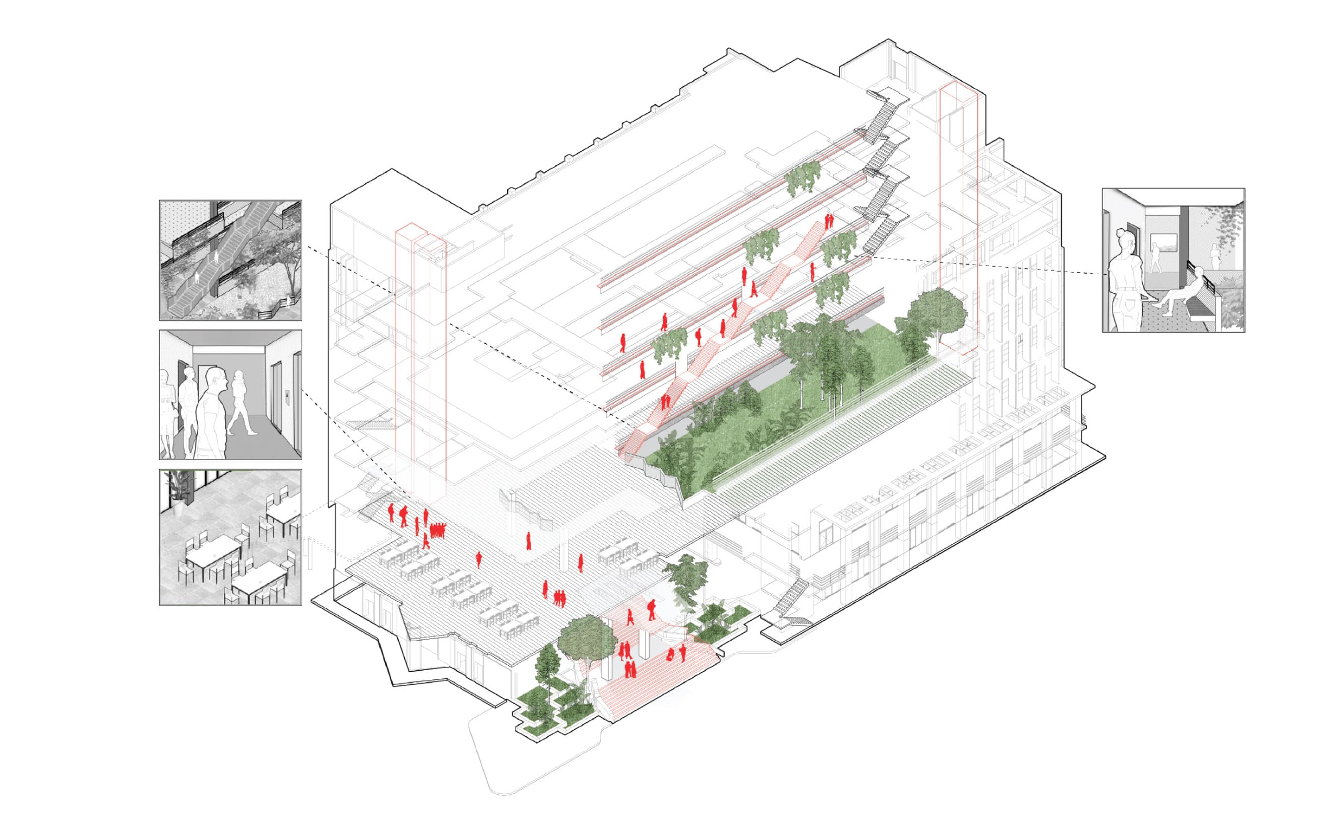 The ELKU building consistently suprises first-time visitors with its unexpected 'oasis' courtyard, a lush expanse of greenery that stretches horizontally and soars vertically along upper-level corridors. Users of all ages feel a deep sense of pride and reverence for the building, evident in both seasoned occupants and young students. This respect is reflected in the diverse Gray spaces that extend throughout the building, inviting engagement and interaction. These spaces go beyond practicality, offering both expansive collective areas like the lobby and seventh-floor sample space, as well as cozy nooks encircling the courtyard for solace or small group activities.