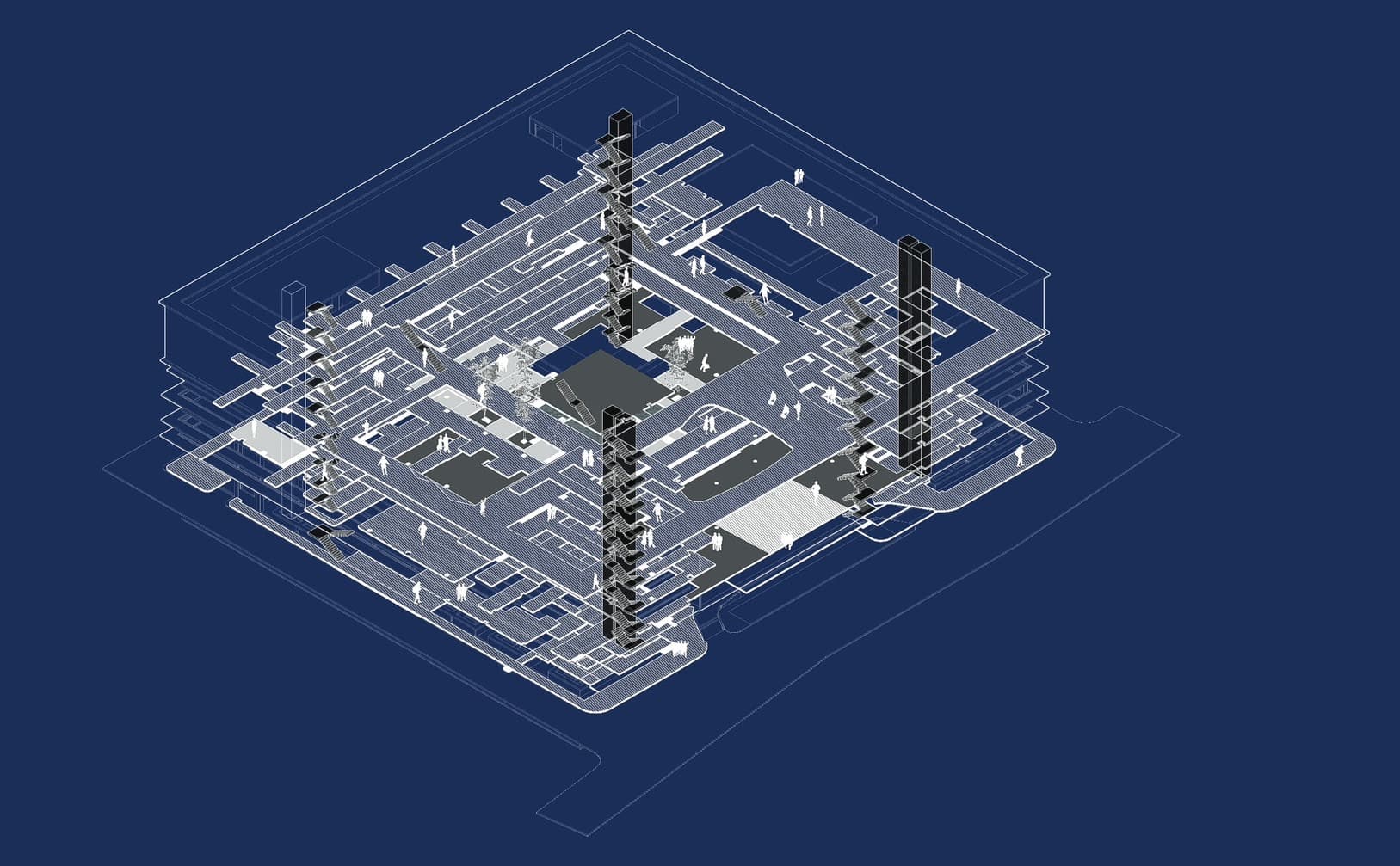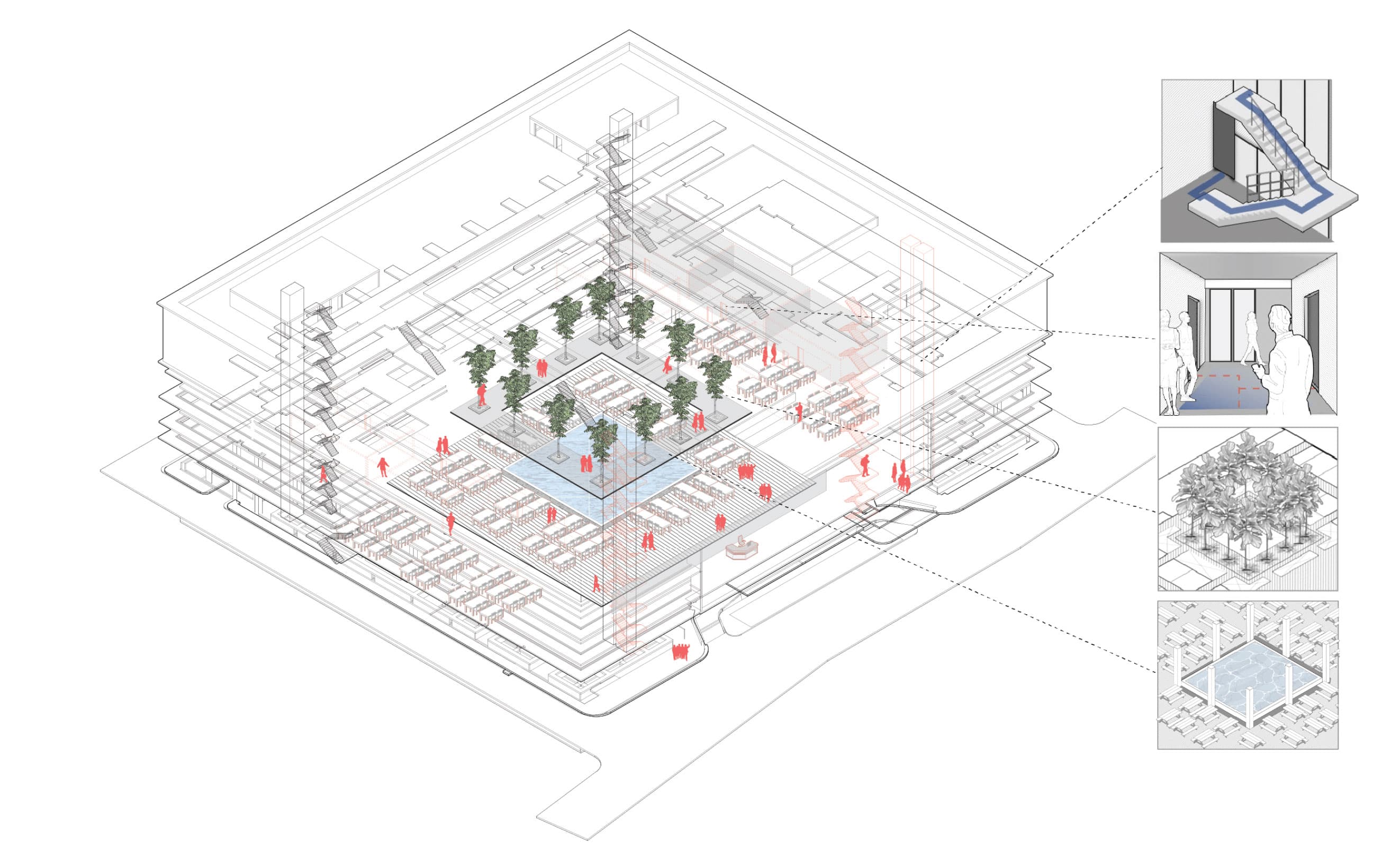 The MUIC building shares a comparable concept with the ELKU building. A special feature, however, lies in the partially exposed courtyard. The courtyard was originally intended to be shaded by extensive tree canopies, but is now exposed to direct sunlight through the presence of smaller tree canopies. This is particularly pronounced on the fourth and second floors, reinforced by glass facades with limited ventilation openings for cross ventilation. Outdoor spaces and extensive corridors allow for natural wind currents without the effects of solar heating. Although there is cross ventilation, its efficiency lags behind that of the SOAD building. The vertical chimney ventilation in the inner courtyard suffers from the negative heating effects caused by the glazing of the inner facade.
