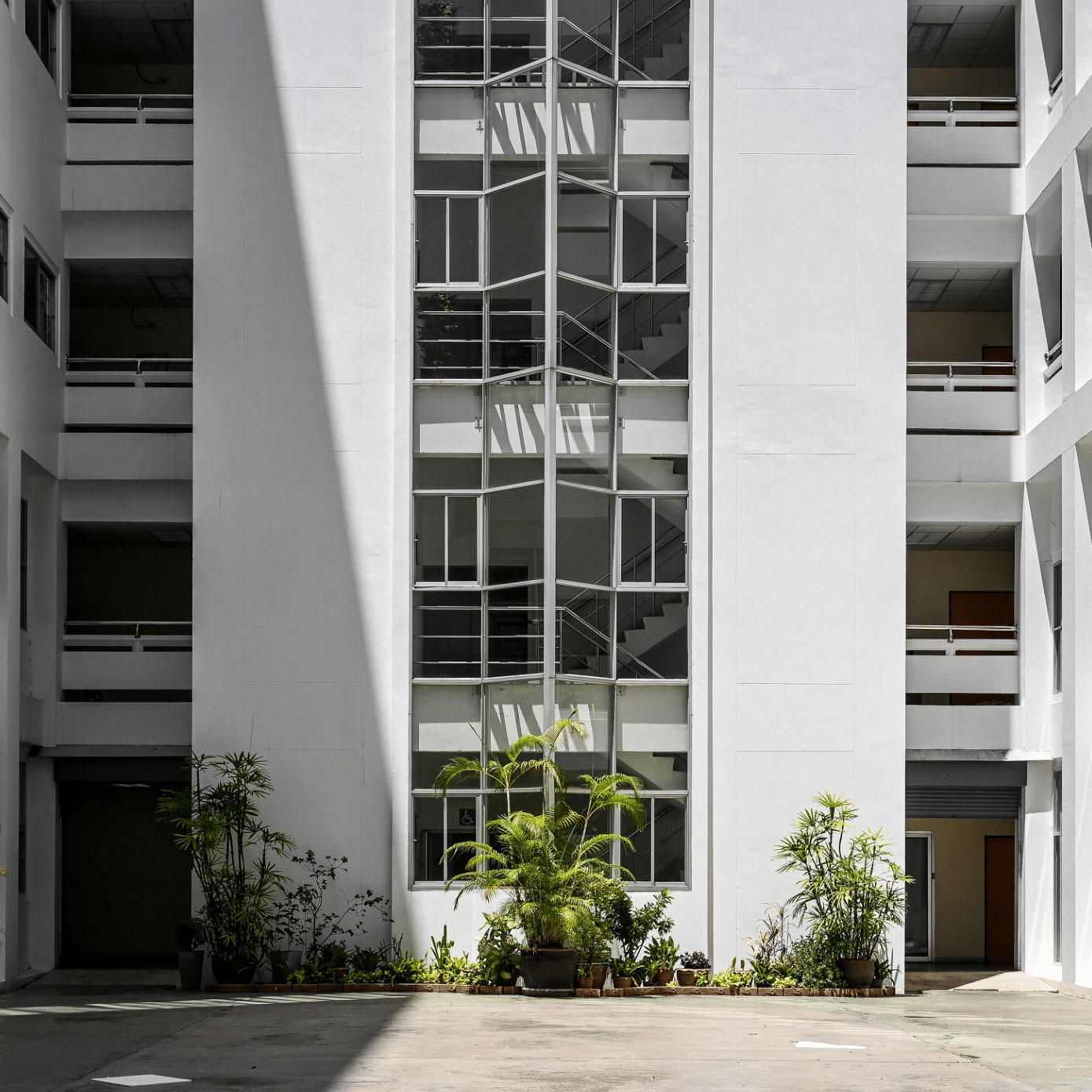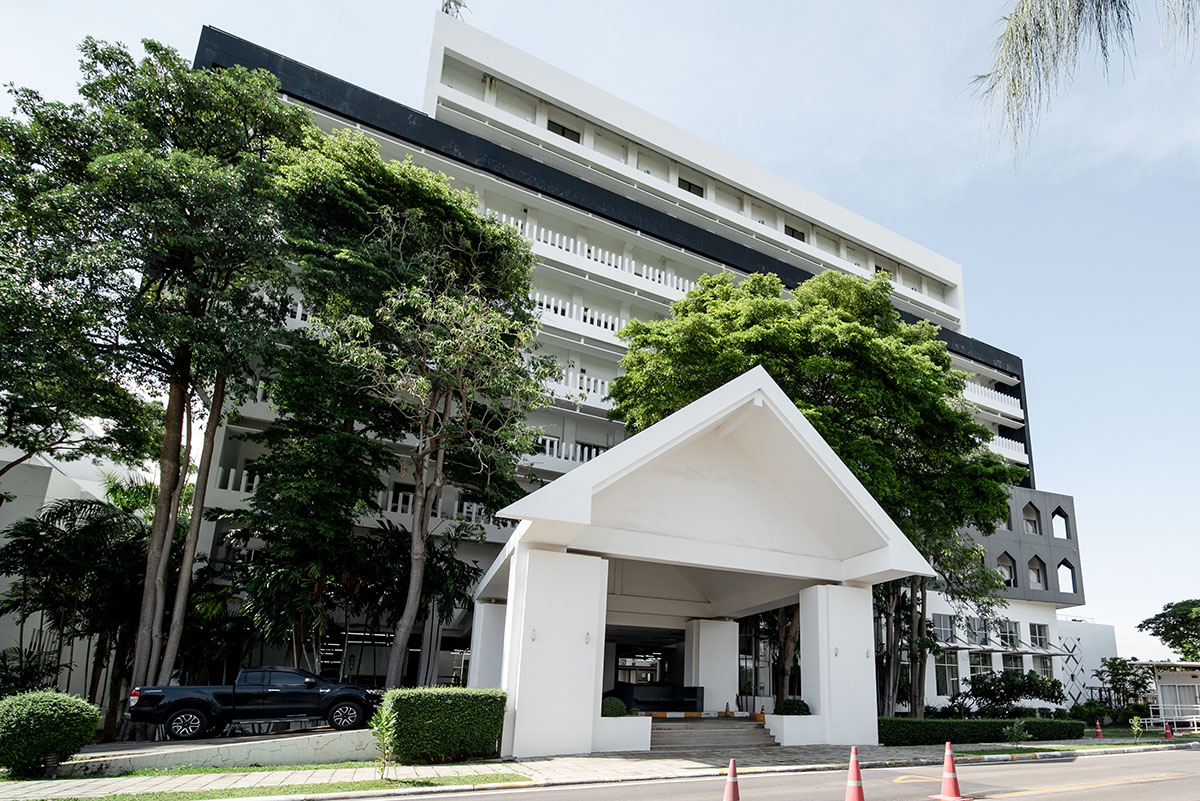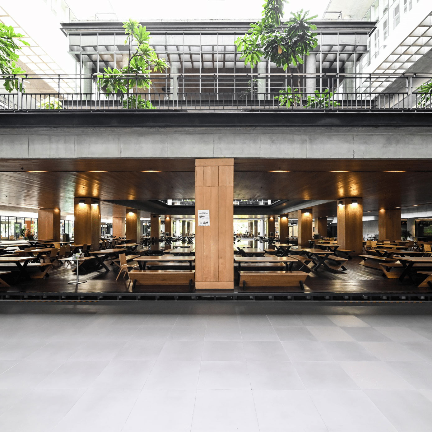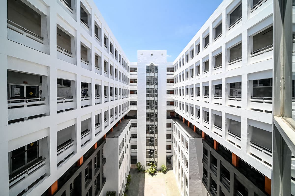 The School for Architecture and Design (SOAD) exemplifies budget-conscious university construction. Completed in 2000, this seven-floor building features a courtyard-centered layout with naturally ventilated single-sided corridors connecting classrooms. Natural lighting is prioritized through large windows, yet green spaces are minimal. Recent renovations aimed to enhance co-working areas. The design adheres to common university building elements: a front drop-off stair, open-air common area for ventilation, and potential student social spaces. Walkways are minimized to meet Thailand's building code. Upper floor classrooms connect via corridors, while each classroom has AC and natural ventilation access. The central untreated courtyard is surrounded by classrooms. Exposed concrete is prevalent, rubble tile aids acoustics, and painted walls dominate. Fire escape compliance places the main stair and elevator opposite the courtyard.