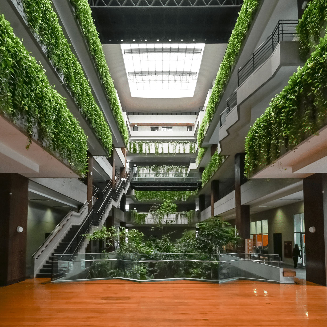 All three buildings have a central inner courtyard that enables visitors and users to orient themselves, gain an overview and vertical distribution to the upper floors. The courtyards also support the use of daylight and natural ventilation of the otherwise deep building dimensions.