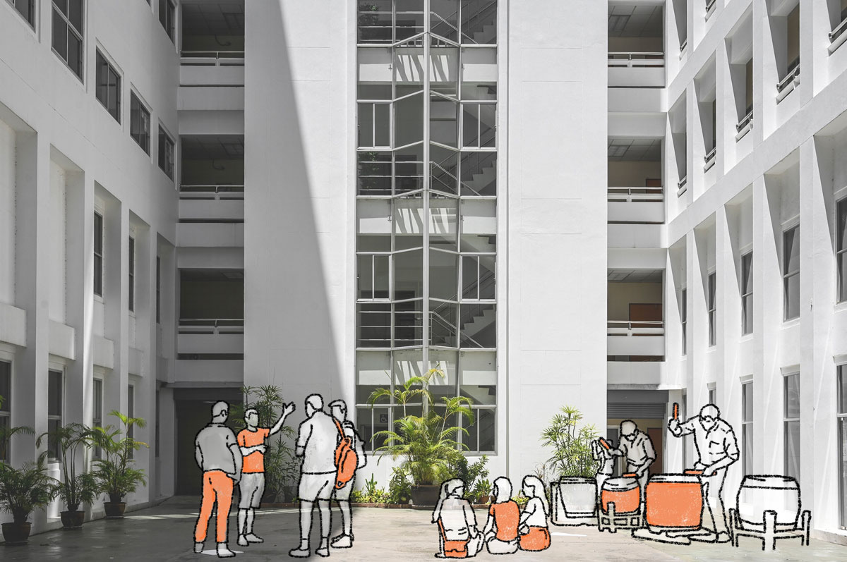 The following images provide impressions of the buildings’ utilized semi-outdoor grey spaces. The sketched people suggest some of the activities that are typically taking place in these areas.